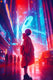 Futuristic cityscape with neon lights and a person in a helmet standing on a rainy street.