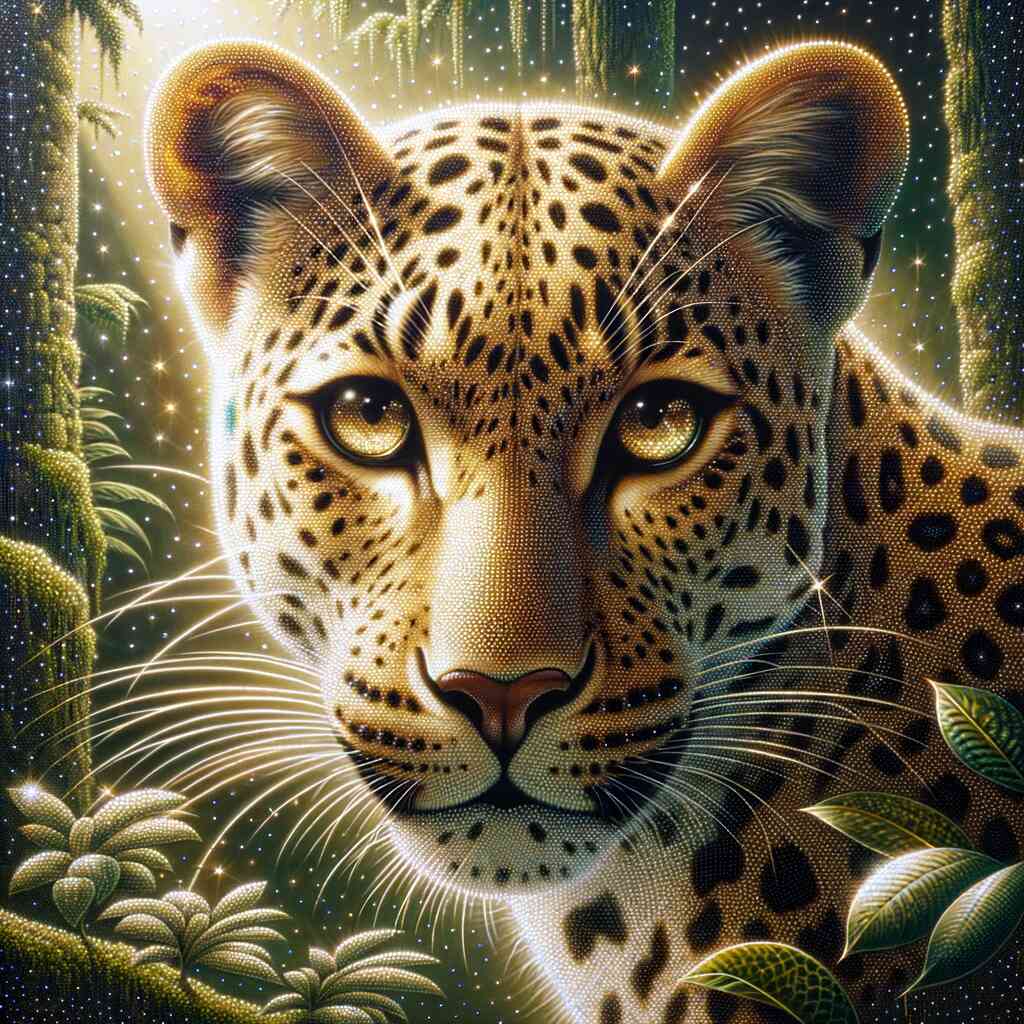 Diamond painting of a leopard portrait featuring green jungle background and sparkling details. Paint by Numbers art.
