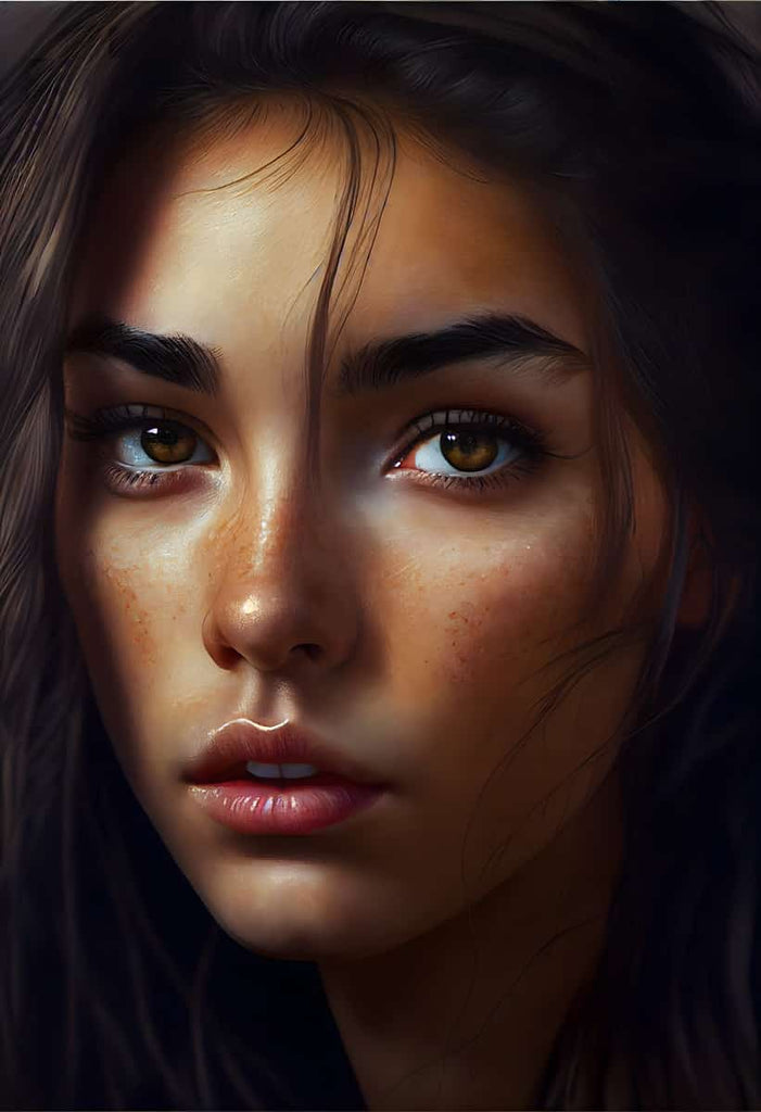 Closeup of a diamond painting featuring a detailed and realistic portrait of a woman's face with sparkling accents.