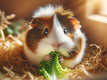 Adorable guinea pig eating a leaf in a cozy bed of straw.