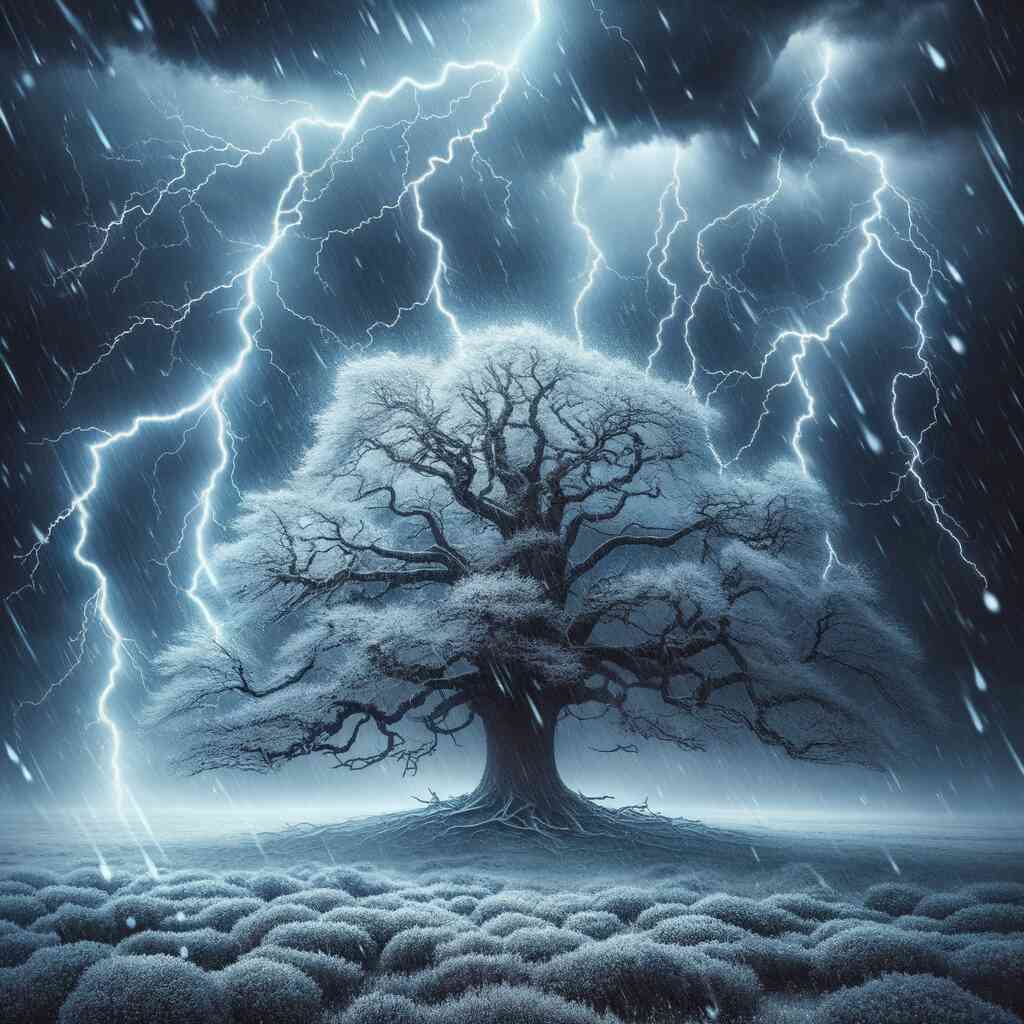 Paint by Numbers - Thunderstorms of Eternity, abstract depiction of a tree amidst an electrifying storm with lightning and cobalt blue sky.